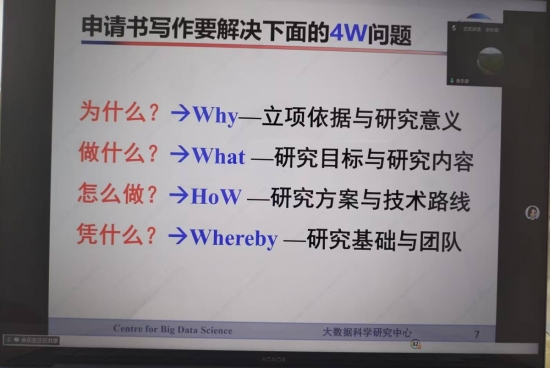 讲座主体围绕“4W”框架展开系统阐述:在“Why”部分,对应立项依据,需清晰阐明研究背景与问题提出,综述国内外相关研究进展并进行评述,最终凝练出明确的科学问题与研究思路;“What”部分涵盖研究目标、内容及关键科学问题,强调目标应具体可行,内容宜聚焦三至五个方面,关键问题须把握两至三个重点,并突出两至三个创新点;“How”部分对应研究方案与可行性分析,包括总体思路、研究方法、技术路线及实施保障;“Whereby”部分则指向研究基础与工作条件,涵盖申请人前期成果、可用平台与设备支撑等。整场讲座内容系统、逻辑清晰、指导性强,有效提升了与会教师对基金申报规范与写作要领的理解,为后续申报工作奠定了扎实基础。