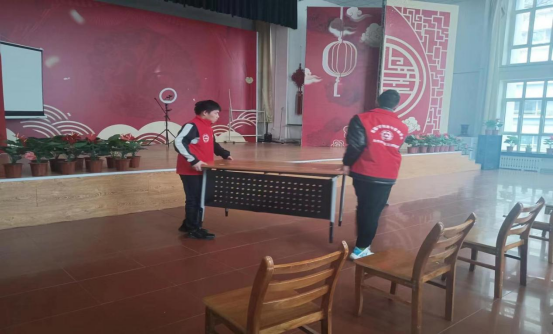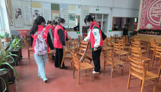 在员工领队的带领下,志愿者们来到老年社区。同学们礼貌的问询着工作人员老年社区的情况,并且积极认领任务,得知下星期要举办清明诗会后,同学们当即行动起来,立即整理桌椅,检查是否有损坏的木椅,帮助搬运沉重的木桌,将场馆桌椅排列整齐,清扫房间···大家虽然是第一次一起参加志愿服务,但每个人都干劲十足,充满激情。
