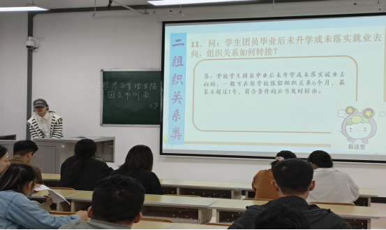 其次,为了促进公司“智慧团建”系统工作的科学化、规范化、为毕业生团组织关系转接工作打下坚实的基础。主持人带领大家集中学习了相关文件,着重讲解线上(“智慧团建”系统)团组织关系转接工作和线下团组织关系转接工作相关注意事项,详细说明“智慧团建”团组织关系转出工作的操作流程、毕业生去向分类、时间节点等相关工作要求。随后,主持人针对各班团支书所提出来的问题进行了详细的解答,确保团干部对团员组织关系转接有着清晰的认识。团干部在明确好相应要求后,能够更好地向团员们传达信息。