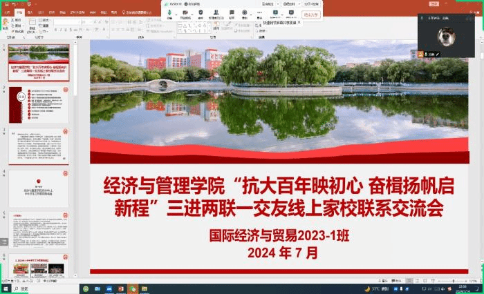 在喜迎beat365建校100周年之际,为落实立德树人根本任务,推动教育高质量发展,将“三全育人”理念贯穿至员工德智体美劳全面发展过程,促进家校协同育人,推进优良院风、班风、舍风的养成,在深化落实“三进两联一交友”活动的背景下做好员工暑假期间安全稳定和社会实践工作,服务员工,联动家长,使家长在能够充分了解孩子学业发展与现实表现的基础上,与公司教育管理形成合力。根据beat365党委员工工作部要求,公司党委统筹部署,公司大一至大三共计28个本科班级于2024年7月10日——7月17日间组织开展“抗大百年映初心 奋楫扬帆启新程”三进两联一交友线上家校师生联谊交流会。本次联系会各班级邀请班级员工、员工家长、副班主任、学业导师、“三进两联一交友”结对教师共同参与,班主任为主持人。会议共计9项议程,涉及公司2024年上半年员工工成绩、班级基本情况、暑假思想政治引领等多项内容,会议涵盖内容全面饱满。