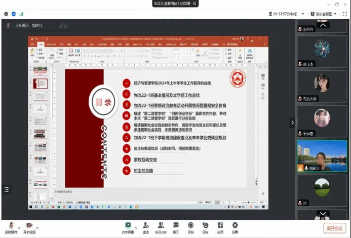 各班级采用腾讯会议的形式开展,会前学工办统一班会模板,各班班主任结合专业年级和班级情况认真制作PPT课件和讲稿。班主任、副班主任、学业导师、“三进两联一交友”结对教师提前进入线上会议做好相关准备。待各位同学、家长进入线上会议室后,班主任亲自考勤,确保本次会议高质量开展。联谊会伊始,班主任对员工及家长的到来表示热烈欢迎,对家长们配合公司安排,合力共助成长的莅临表示感谢,对本次参加会议的老师和会议议程进行了介绍(1.2024年上半年员工工作取得的成绩2.介绍班级上学期基本情况3.介绍班级思想政治教育活动开展情况4.介绍“第二课堂学时”和“创新创业学分”对毕业的影响5.督促2024年暑期社会实践务实开展6.班级展望7.解读校历8.家校互动交流9.班主任总结);班会正式开始,各班班主任重点围绕班级基本情况和暑期安全教育进行解读,从课程学习、考勤(上课+晚自习)、学科竞赛、奖助学金评选、入党入团、参与校园文化活动6个方面对班级本学年的工作进行总结,认真结合成绩单,参照每名员工的在校现实状态,直面员工各类问题,剖析成绩背后的行为逻辑。