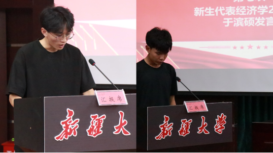 新生代表经济学2024-2于滨硕做入学发言,从初来新大的忐忑与新鲜,到军训队列的汗水与感动,再到青春使命的肩负与赓续,抒发了对老员工涯的饱满热情和昂扬斗志。