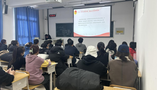 活动伊始,团支书带领同学们齐唱《光荣啊,中国共青团》,同学们激情澎湃,内心充满骄傲和自豪。随后,团支书带领全体同学深入了解了学习法律法规的必要性,并观看了“奉法者强则国强”的视频,视频通过引入习近平总书记