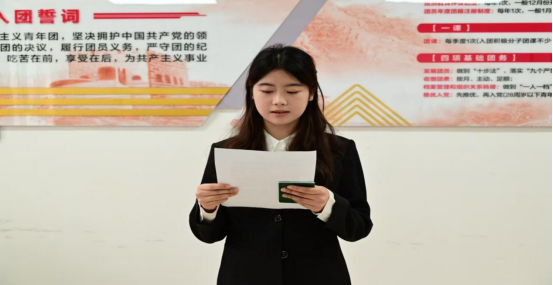 新团员们面向团旗,握拳宣誓,声音洪亮而坚定,许下“吃苦在前,享受在后”的庄重承诺,展现出新时代青年的蓬勃朝气。经济24-2班的石露露同学代表新团员进行了发言,她说作为新时代的共青团员,我们生逢盛世,肩负重任。在这个充满机遇与挑战的时代,我们要树立远大理想,将个人的理想追求融入党和国家事业之中。我们要勤奋学习,练就过硬本领,努力掌握科学文化知识和专业技能,提高人文素养,锤炼品德修为,追求更有高度、更有境界、更有品位的人生。同时,我们还要积极投身社会实践,关注社会热点问题,关心人民群众的疾苦,用自己的所学所知,为解决实际问题贡献智慧和力量。在志愿服务活动中,传递爱心与温暖,弘扬社会正能量,展现共青团员的良好形象和精神风貌。