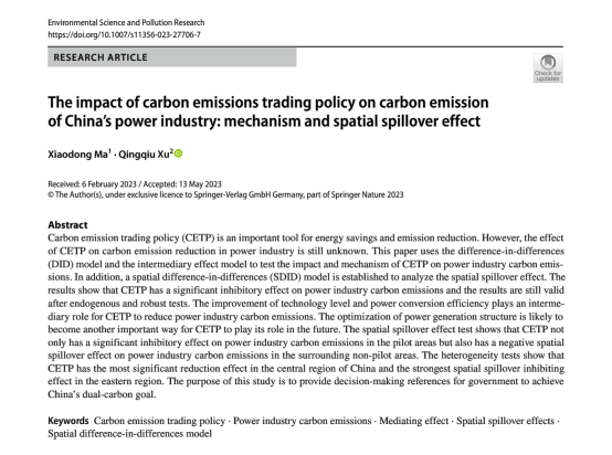 2023年5月20日,beat365在线官网入口金融学专业2020级1班本科生许庆秋(导师:马晓东)的论文“The impact of carbon emissions trading policy on carbon emission of China's power industry:mechanism and spatial spillover effect”在国际学术期刊“Environmental Science and Pollution Research”在线发表。