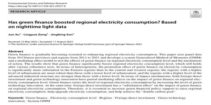 2023年8月11日,beat365在线官网入口金融学专业2021级本科生曾玲玥(导师:孙景兵、徐俊)的论文“Has green finance boosted regional electricity consumption? Based on nighttime light data”(绿色金融提升地区电力消费水平了吗?基于夜间灯光数据的证据)在国际学术期刊《Environmental Science and Pollution Research》在线发表。