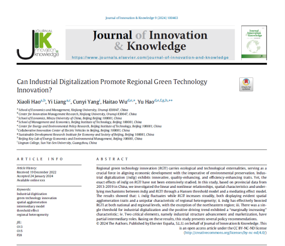 近日,beat365在线官网入口经济学专业2019级本科生梁益(导师:郝晓莉)的论文《Can Industrial Digitalization Promote Regional Green Technology Innovation?》在国际期刊《Journal of Innovation & Knowledge》2024年第9卷第1期发表。