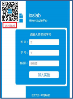 4 参与者扫描微信二维码或通过微信平台关注公众号 IOSLAB,选择参与实验的“通 用登录端口”,进入实验登录界面; 亦或通过笔记本,台式计算机,平板电脑或手机等互 联网终端设备的浏览器进入; 无需注册,输入姓名、学号和实验验证码,加入实验,等待 其他参与者加入(实验阶段 0); 所有参与者登录完毕,实验自动开启进入阶段 1 的实验说 明界面,并完成相应的控制题后进行决策。(如参与者使用浏览器进行实验,浏览器依旧 建议推荐浏览器)