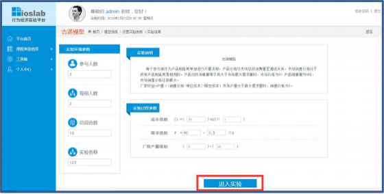 3 主持者点击所选择实验中的开始,进入实验参数界面 ,设置关于参与人数、每组 人数、总回合数和实验名字等实验环境参数; 依据实验案例及实验模型,设置实验过程参 数,点击进入实验,进入实验进程界面,生成实验验证码。